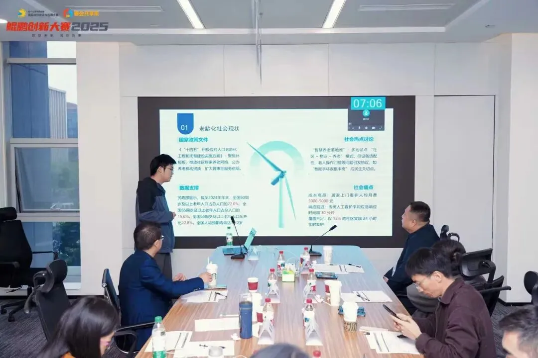 CQU-WayMaker-AI守护星队的成员以清晰的逻辑脉络展开项目介绍:从老龄化社会的项目背景、技术架构到核心优势,再到实际应用效果,每一页演示文稿都凝聚着团队的心血。团队成员结合生动案例将复杂的技术原理通俗化呈现,面对评委关于技术的提问,团队成员沉着应答,逻辑清晰、论据扎实,充分展现了扎实的专业功底。